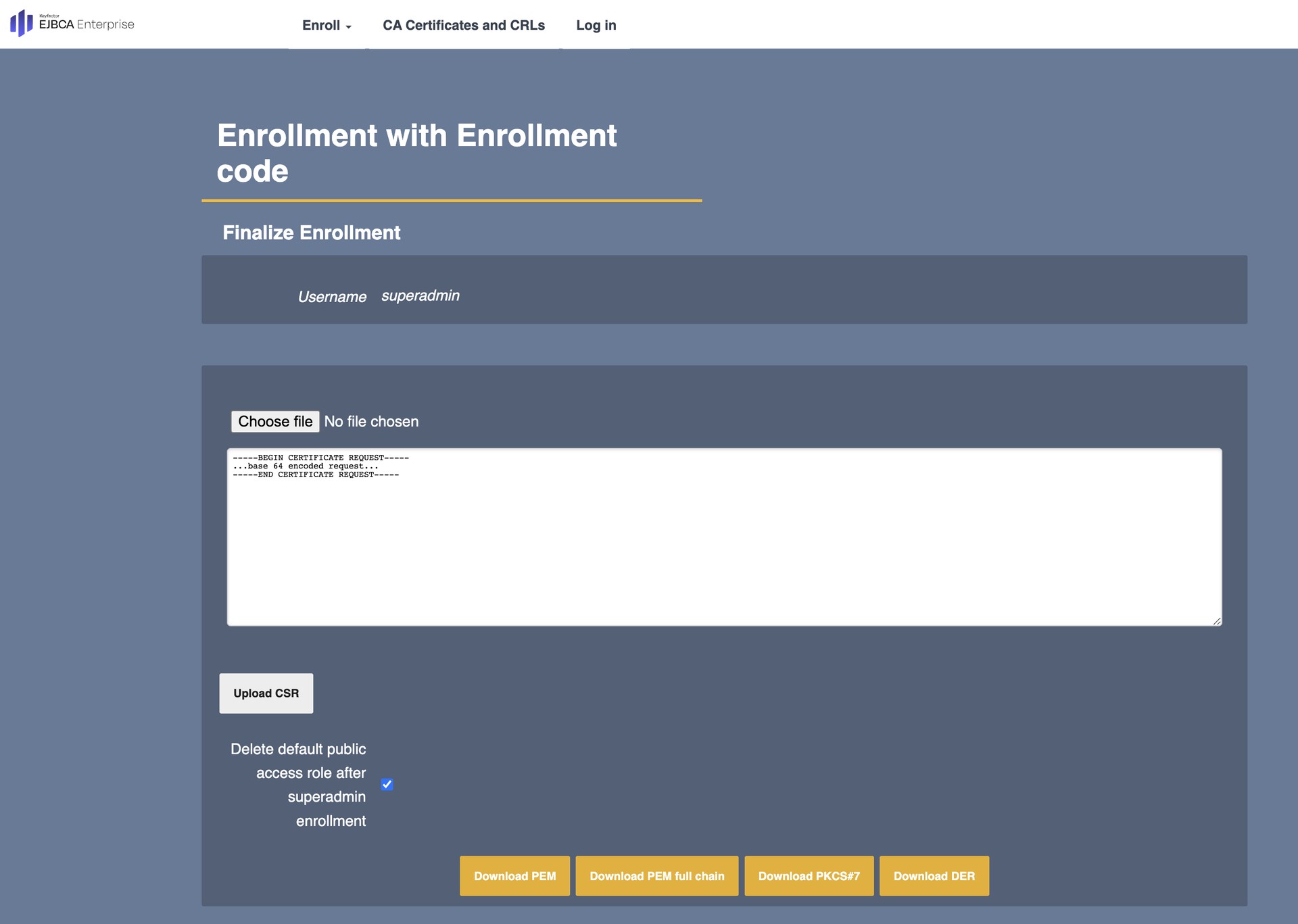 Choose file or paste the certificate signing request you want to use to issue the initial SuperAdmin certificate.