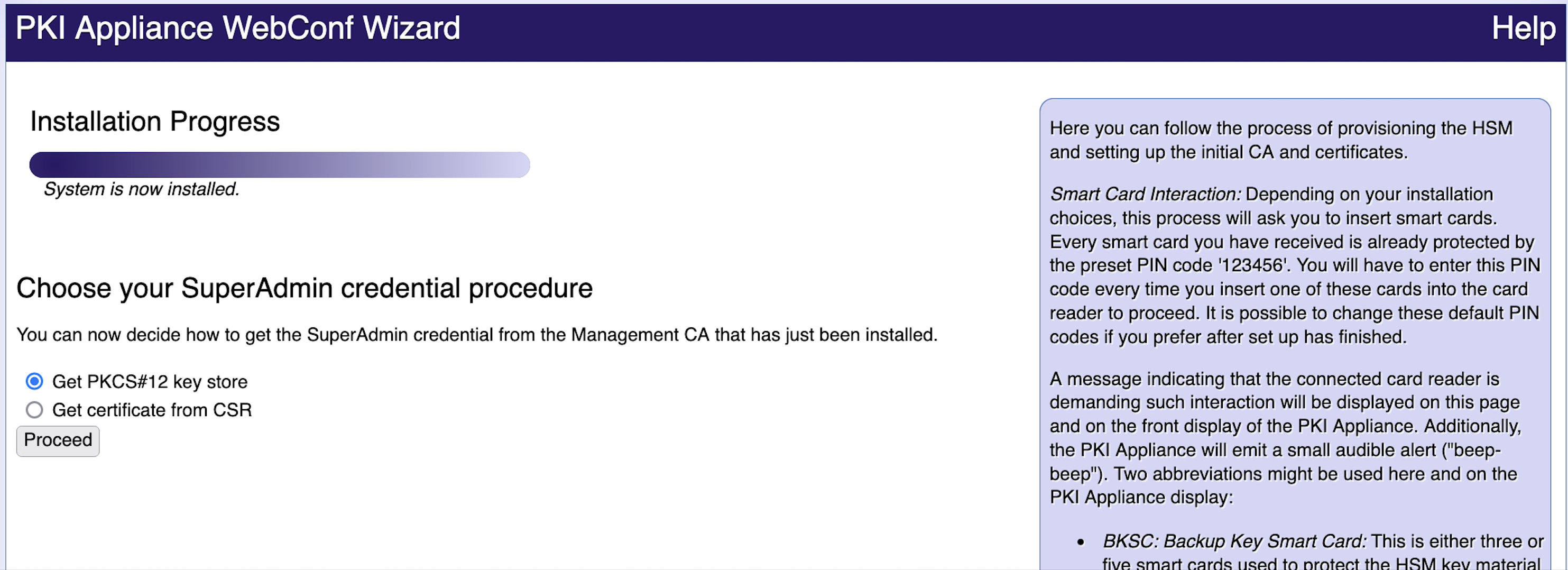 - Step 5: Running WebConf Wizard#Get PKCS#12 key store: The SuperAdmin certificate and corresponding key pair is generated on the Hardware Appliance and manually imported into the browser.