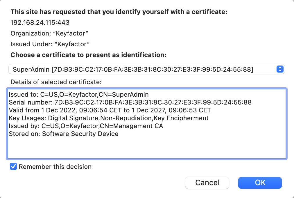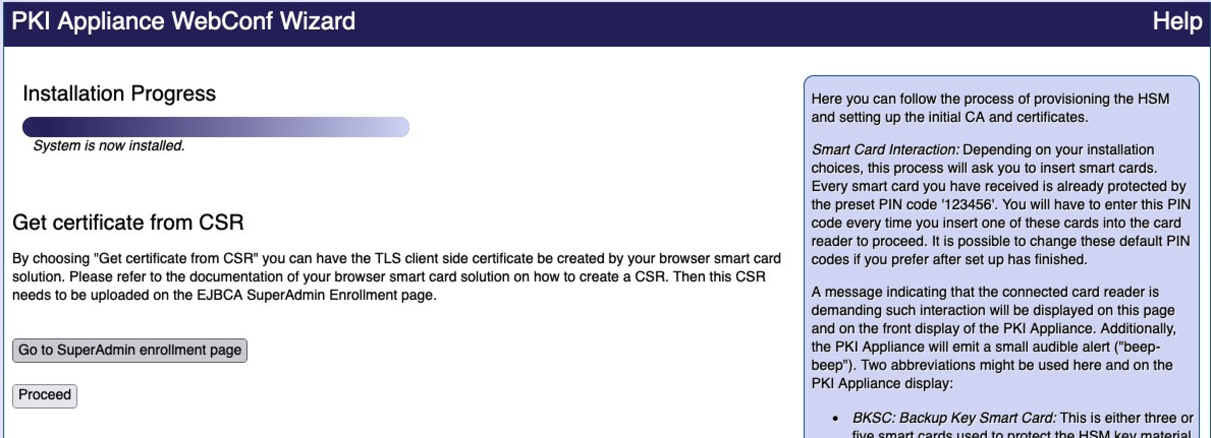 Only enroll the initial SuperAdmin certificate with the option Get certificate from CSR (Certificate Signing Request) if you cannot use any of the other methods. Creating the CSR and installing the resulting certificate so that it is usable for client TLS authentication is outside the scope of this document.