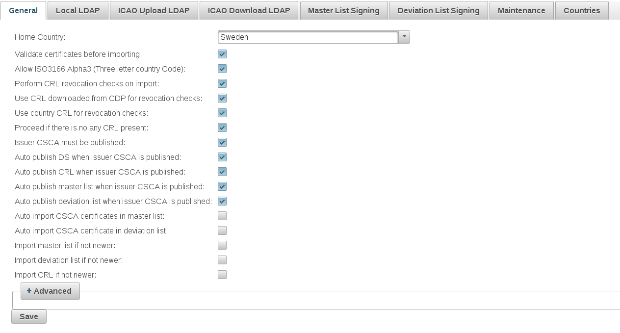 Use country CRL for revocation checks | If selected, revocation check will also be performed against the latest country CRL. This is a ICAO feature and not part of X509. Default: true. |