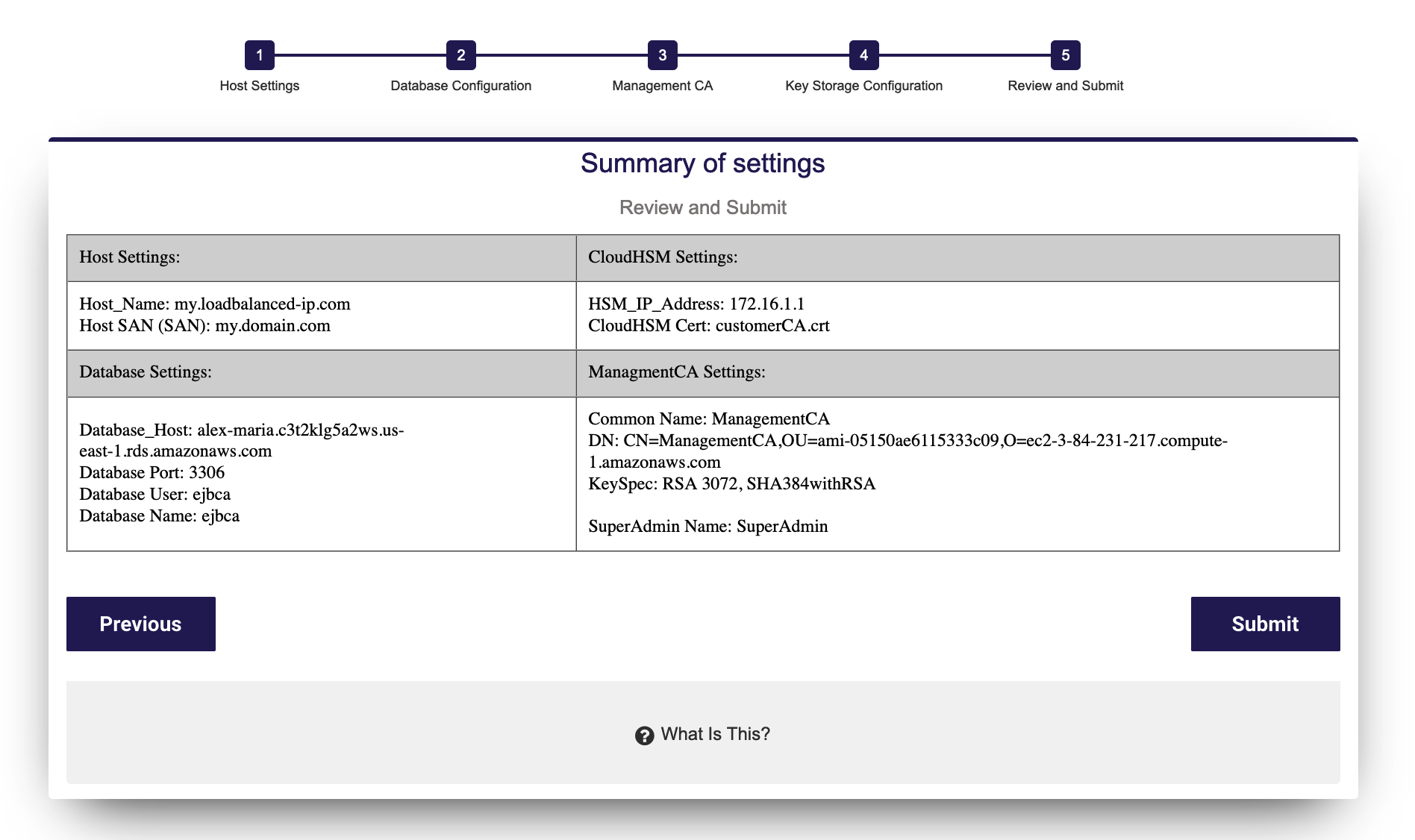 To set up your own HSM later, skip this step and click Next to continue to the Review and Submit page to review a summary of all settings.