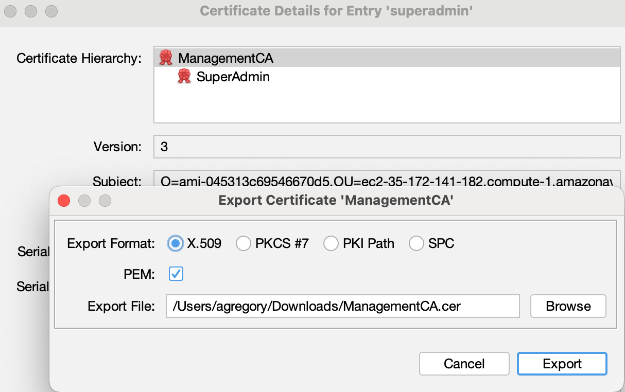 Subject fields | OU= and O= can be configured for the ManagentCA DN. Includes the ReservationID, AMI-ID of the instance by default. Certificates are listed in the browser store by "O=". |