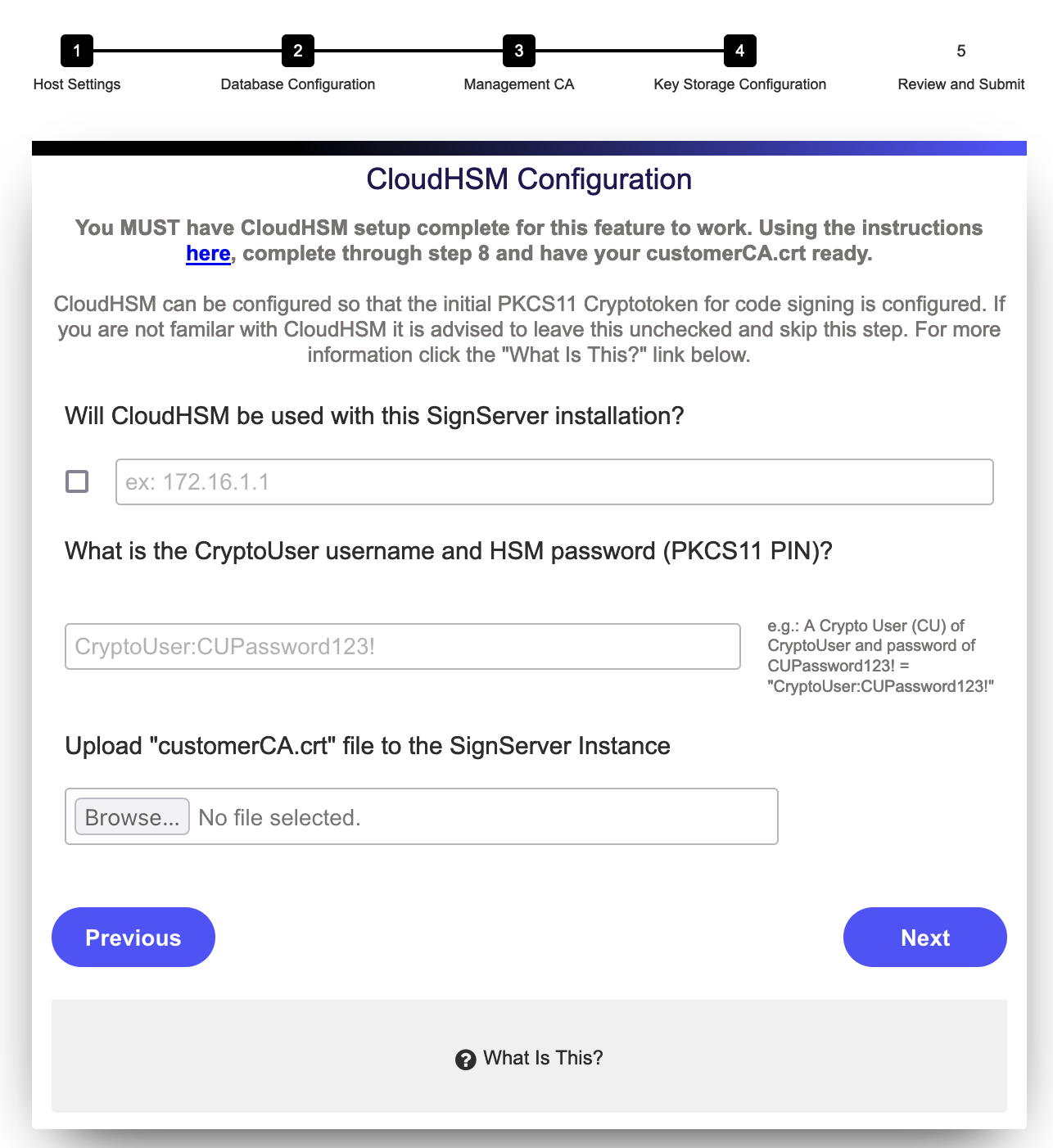 The CloudHSM Configuration settings are optional. SignServer will create keys for the the first crypto worker in the database by default. CloudHSM key generation can be configured now so that the initial crypto worker keys are stored and created in CloudHSM. If you would like to have those keys created in a CloudHSM cluster, you can enter the credentials for your cluster here.