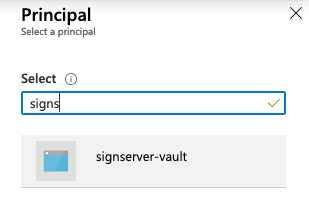 Search for the App Registration added in the previous section Creating an App Registration in Active Directory. In this example, select the name "signserver-vault" and click Select.
