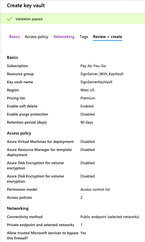 The following shows how to create the Azure Key Vault.