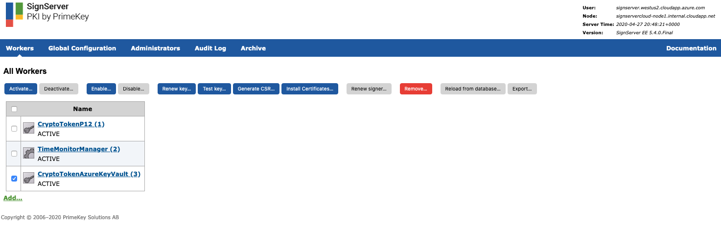 WORKERGENID1.DEFAULTKEY: The name of the first key that SignServer uses to activate the Crypto Token. The key can be created in the Azure Key Vault user interface according to the previous step Creating First Key for SignServer.