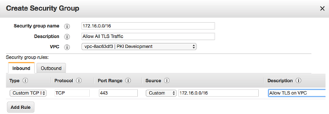 Create a security group that allows for TLS traffic within the VPCs. In this example, the VPC internal address space is 172.16.0.0/16 in US-East-1. Create a Security Group called Allow All TLS Traffic with the following rules: