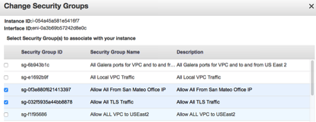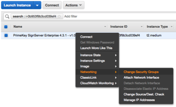 This allows any connections outbound to any address and any inbound connection on port 443 from any address on the 172.16.0.0/16 subnet. The same rule in the other VPC will also need the same rule configured. These rules may be tightened as required for the organization.Apply these Security Groups to the EJBCA Cloud and SignServer Cloud Nodes in each of the VPCs. Right-click the node, select Networking and then Change Security Groups: