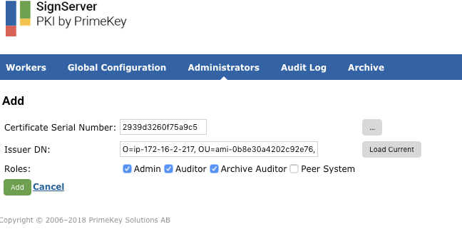 Click Load Current and add the Roles: Admin, Auditor, and Archive Auditor for the EJBCA SuperAdmin, and then click Add.