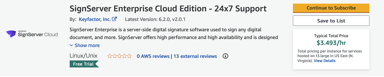 Select the instance type to use and click the title of the desired listing, in this case SignServer Enterprise Cloud Edition 24x7 Support. Review the details and click Continue to Subscribe.