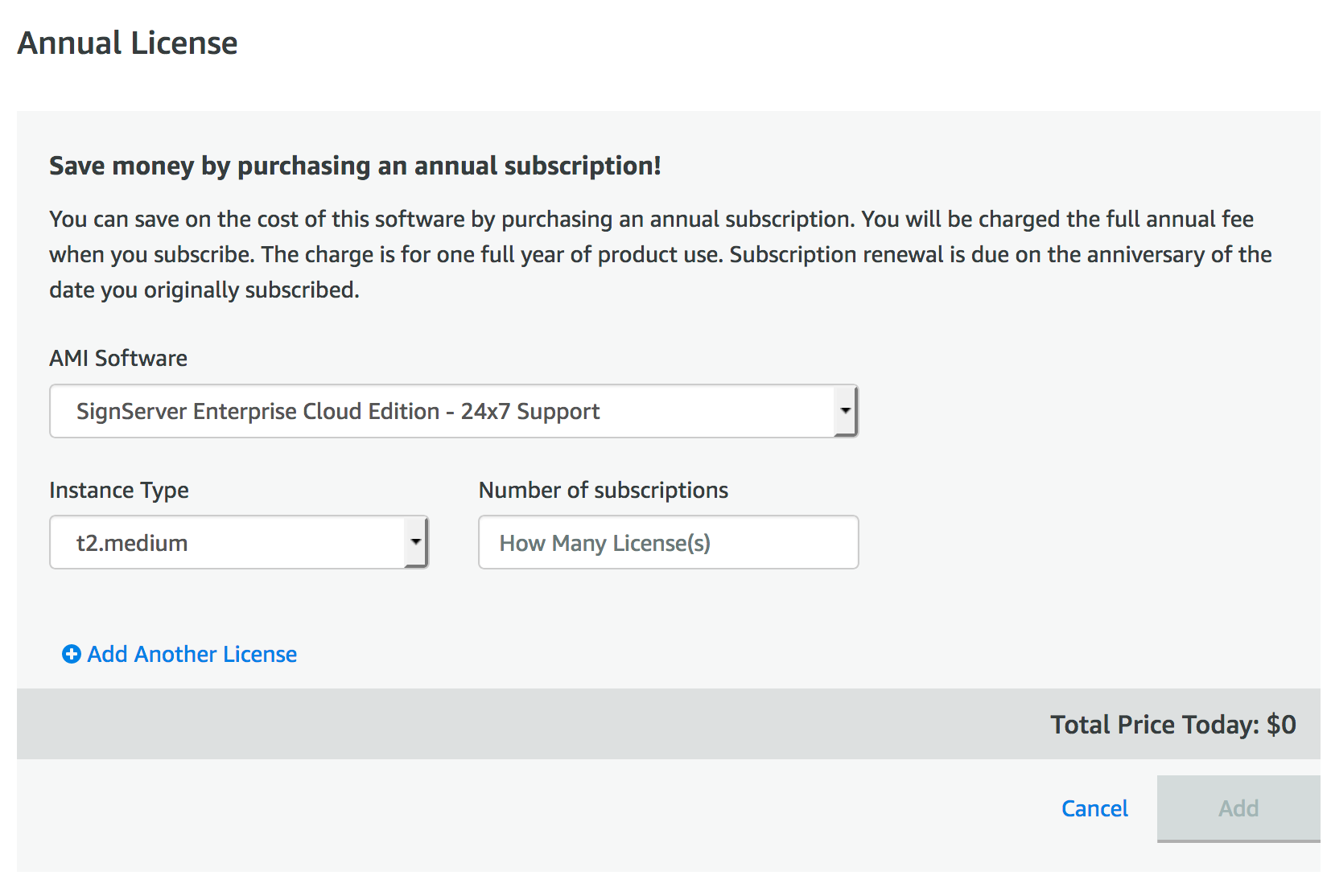 Optionally, you can select an annual option to save 20% off the AWS list price. Skip this section if this is not desired. If you choose this option, select the Instance Type, and number of subscriptions desired.