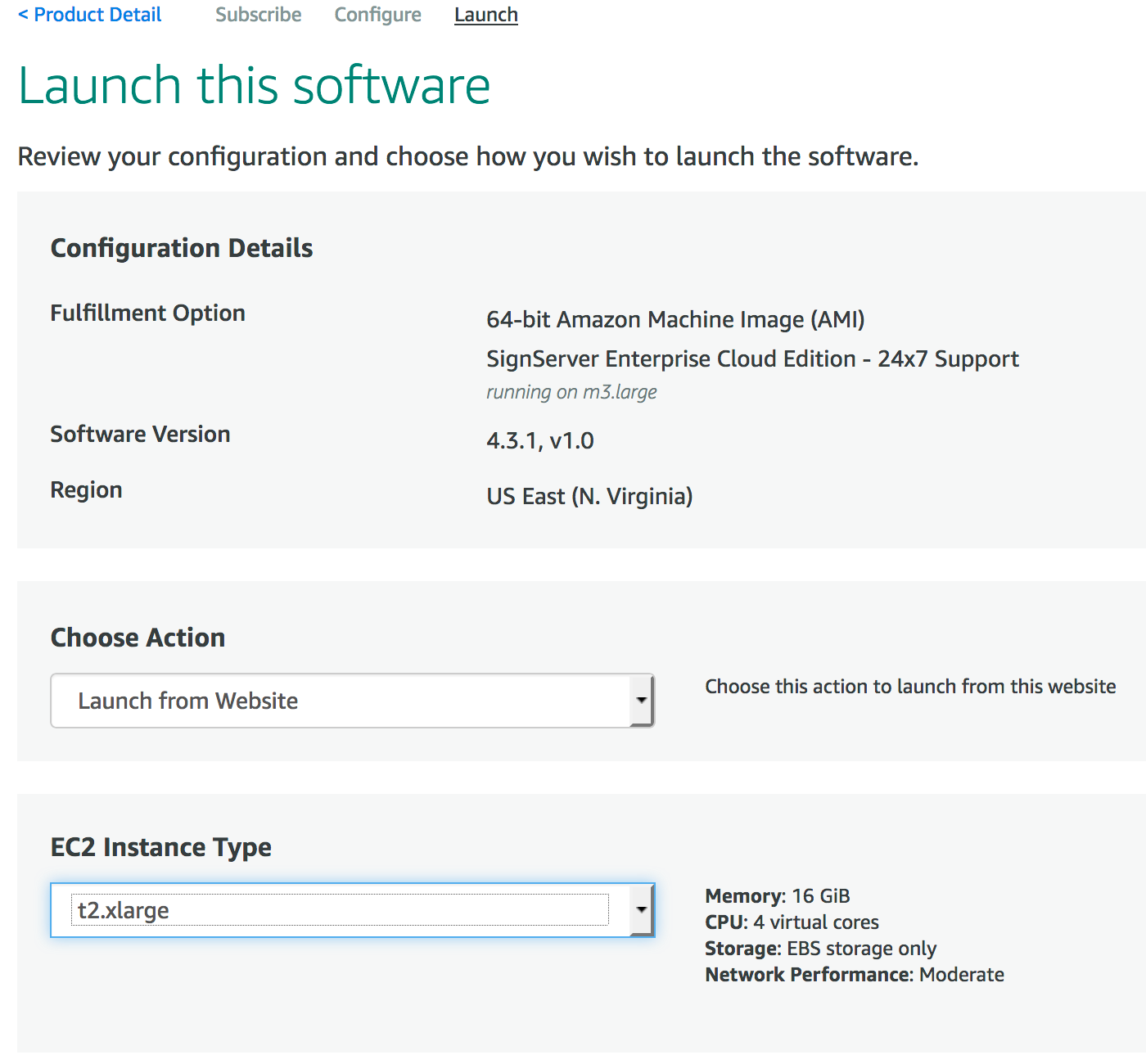 The EC2 Console is a web interface that allows you to configure the SignServer Cloud instance details from a web browser before you launch it. Follow the instructions below to launch a SignServer Cloud EC2 instance: