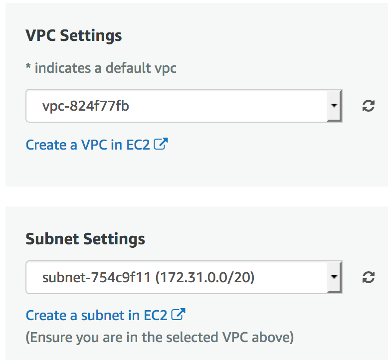 Select the desired VPC and Subnet. For more information on getting started with Amazon Virtual Private Cloud (Amazon VPC), refer to AWS Documentation on VPCs and Subnets.