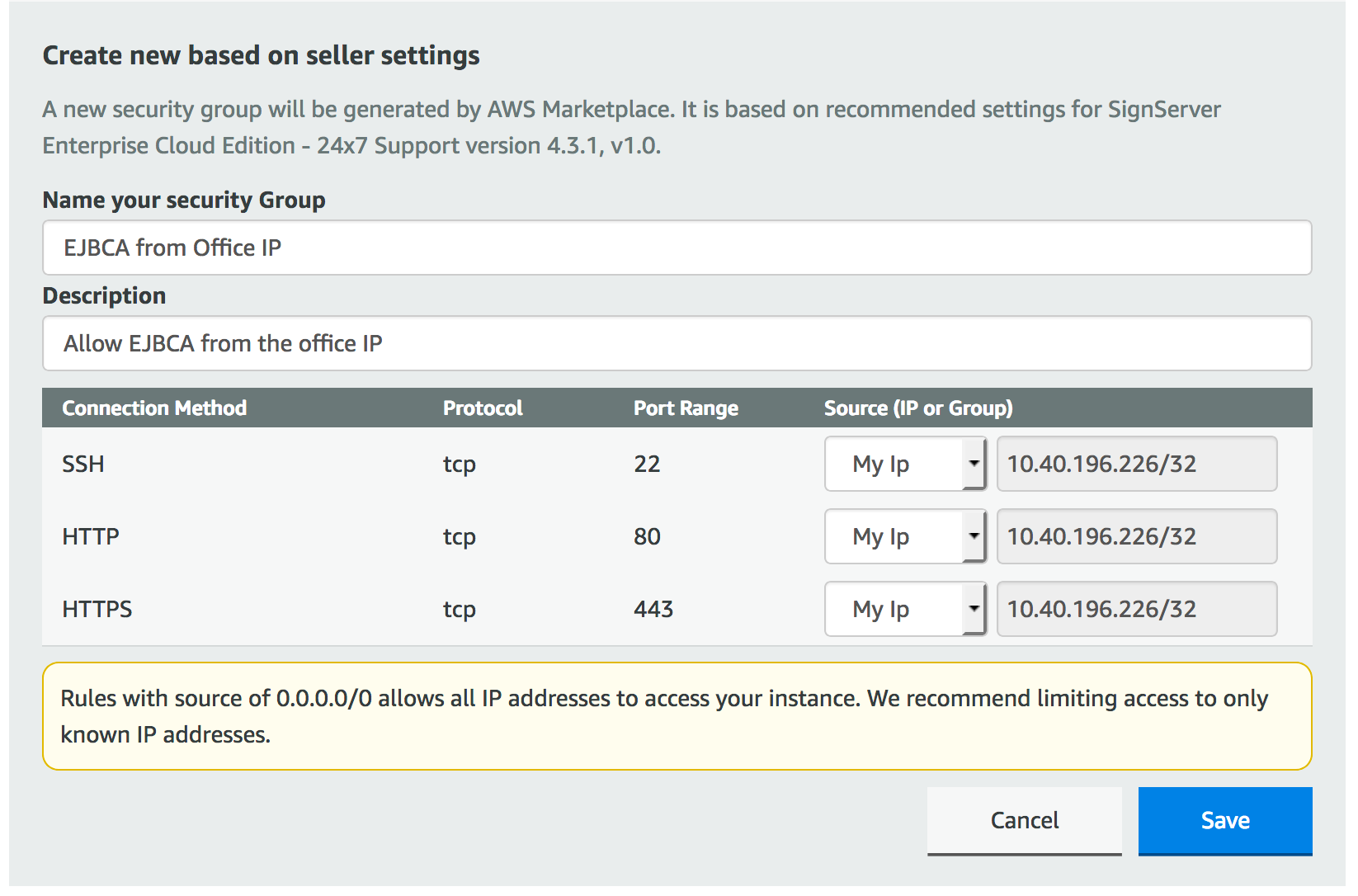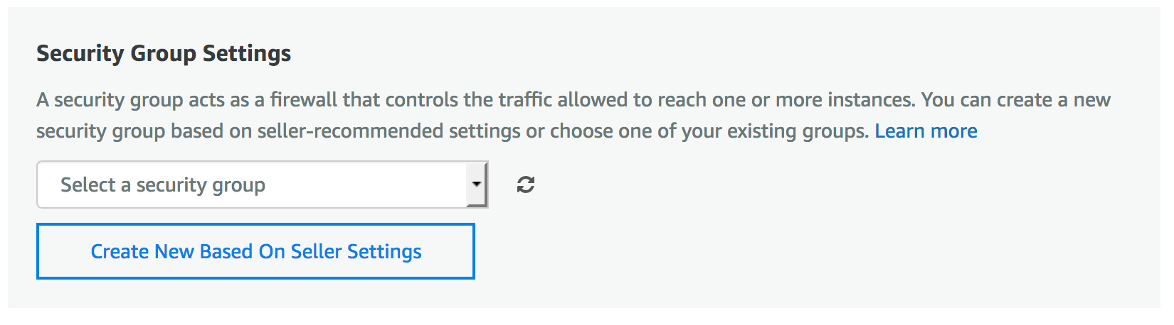 For the Security Group, click the button that allows Create New Based on Seller Settings.