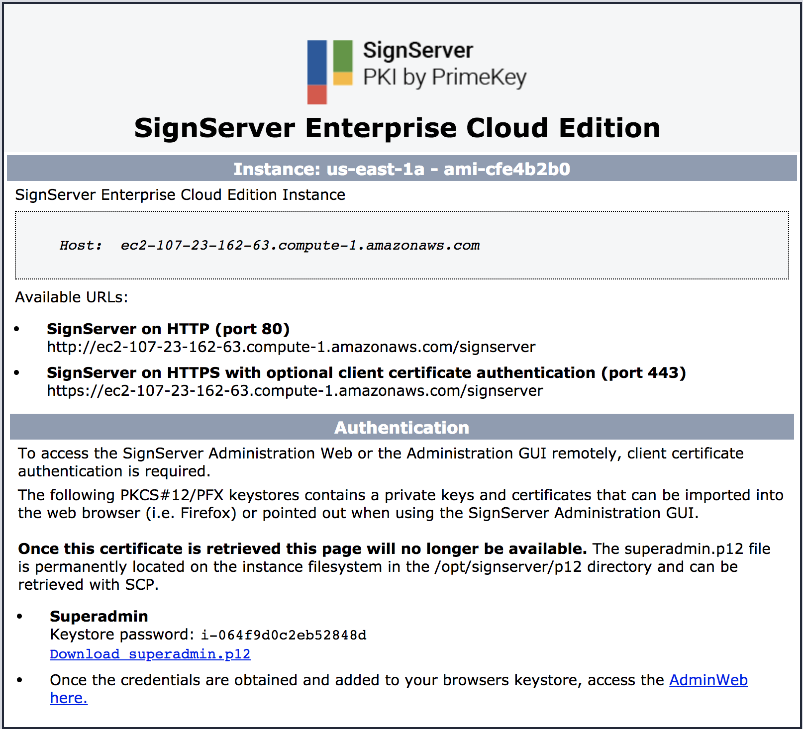 Note that once the download link is selected the keystore retrieval page will no longer be accessible. If the p12 file is ever lost it can be retrieved from the instance directly from the directory /opt/signserver/p12/pem.