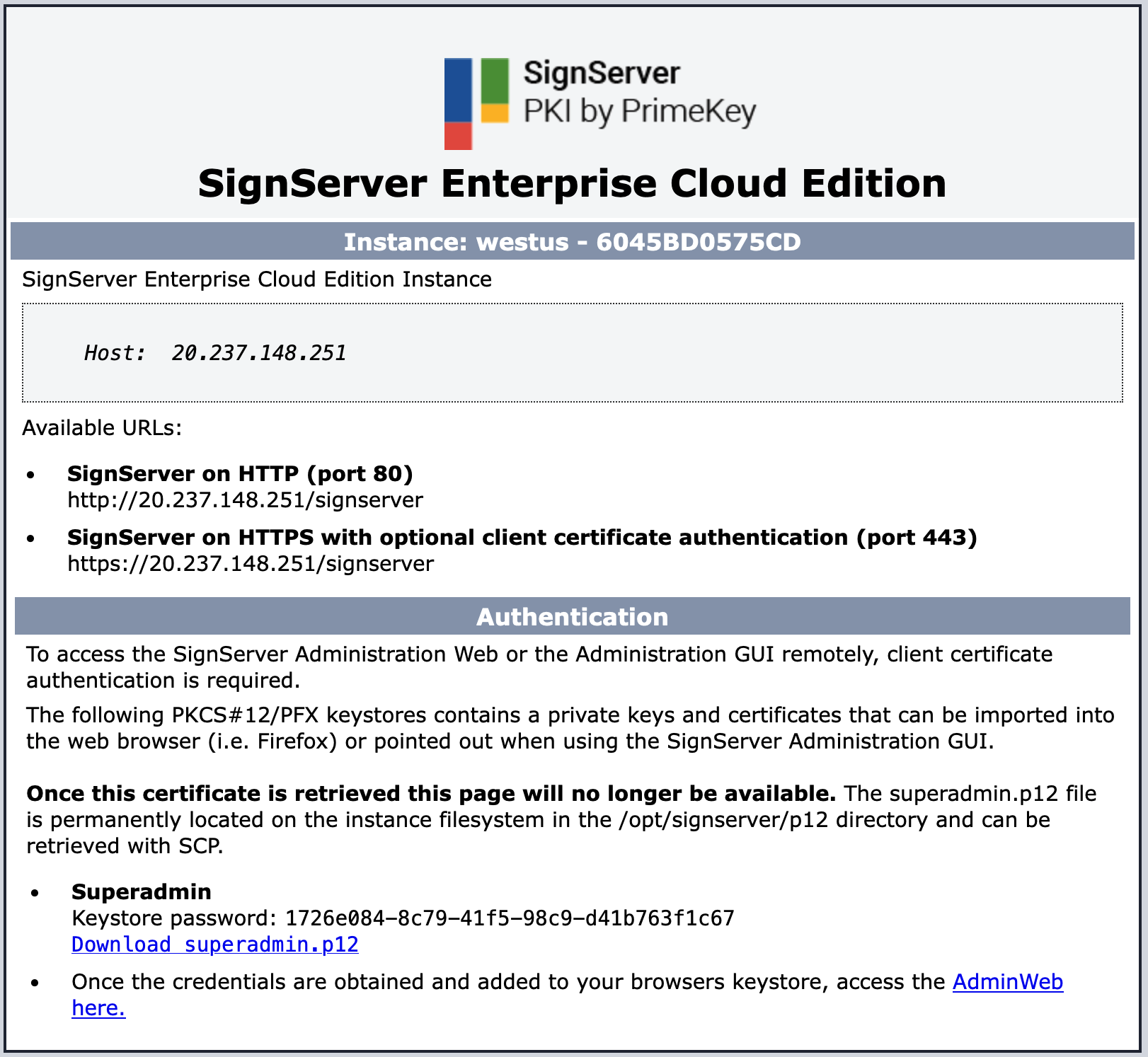 To access the Admin Web of the deployed SignServer Cloud instance, the superadmin credentials need to be retrieved from the server and installed on a system or browser.