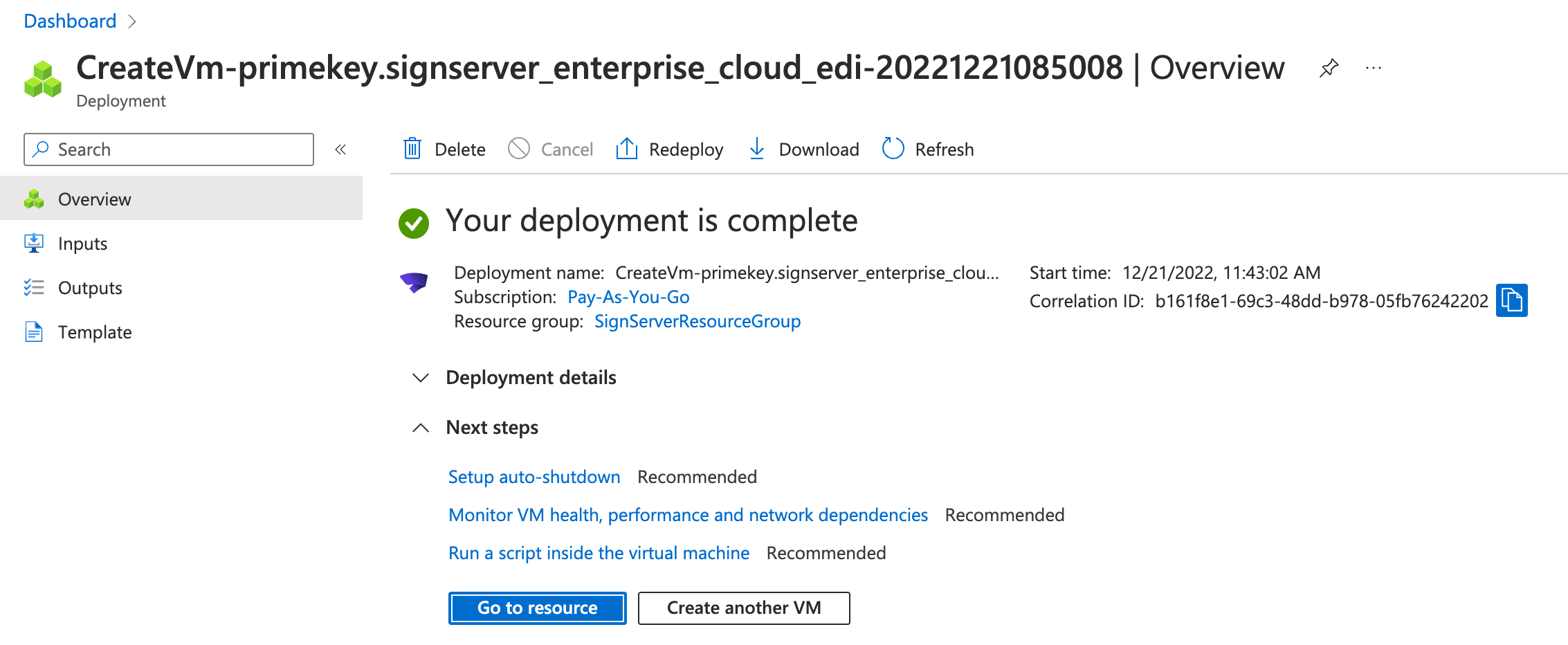 After launching the instance in Azure, click the Go to resource button to get to the resource group Overview: