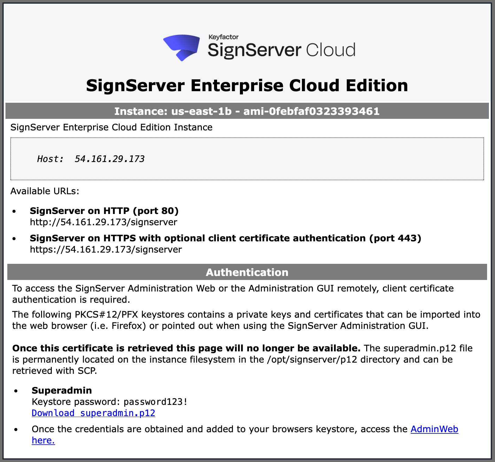Note that once the download link is selected the keystore retrieval page will no longer be accessible. If the p12 file is ever lost it can be retrieved from the instance directly from the directory /opt/signserver/p12/pem.