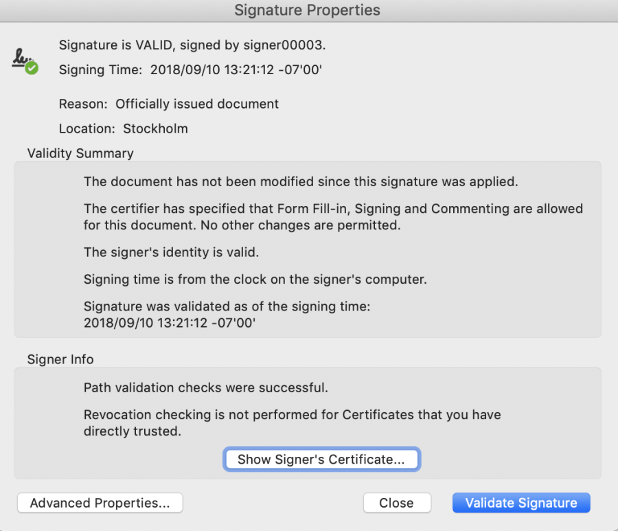 Adobe Acrobat Reader shows that the PDF is signed by a source but that it "has problems". This is because it does not know of our signer certificate.