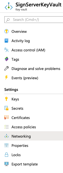 Browse to the Key Vault that SignServer is using, in this example SignServerKeyVault, and select Networking.