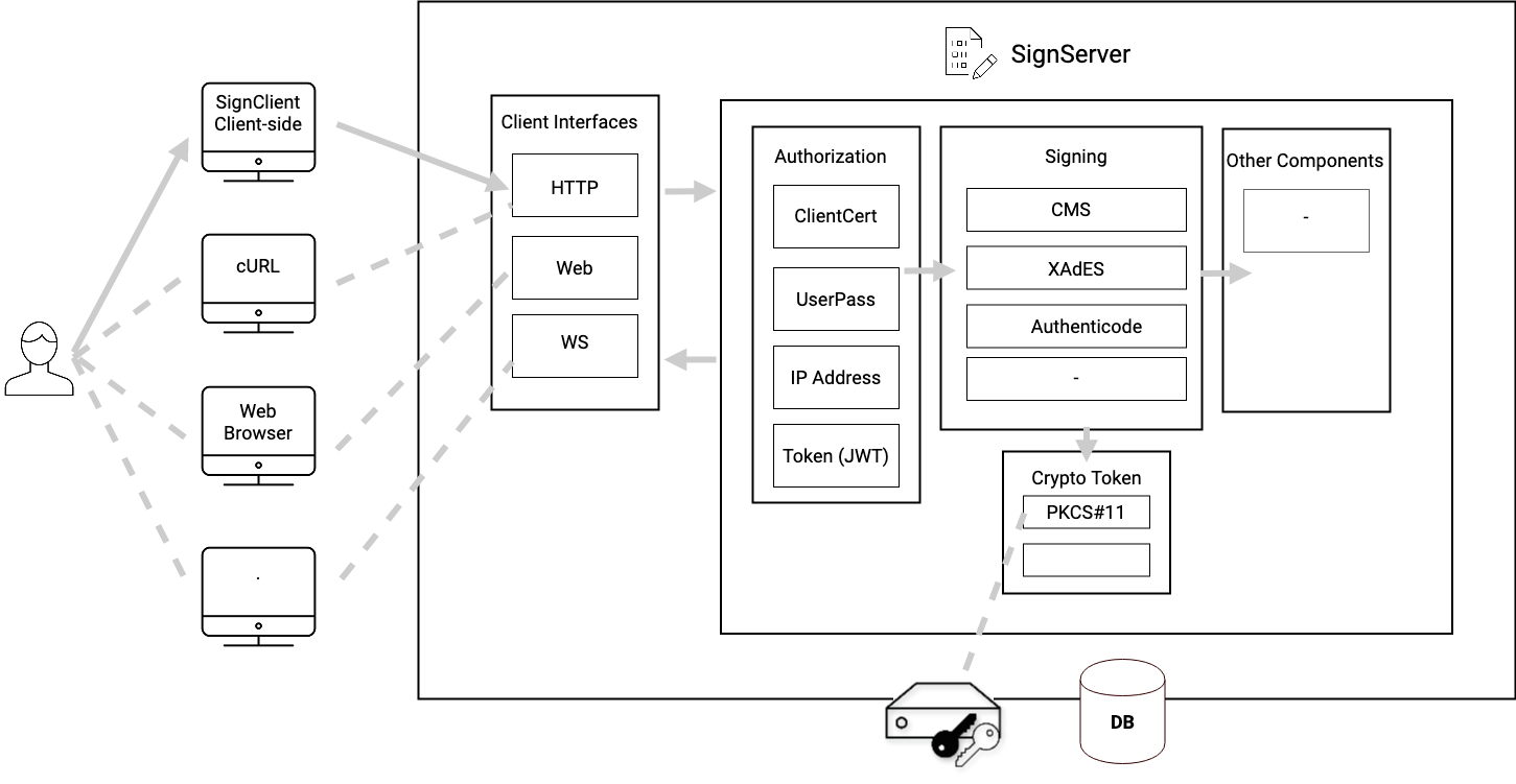 Internally in SignServer, workers and components are handling the request performing the authentication/authorization or interacting with external components. The configuration and logs can optionally be stored in a database.