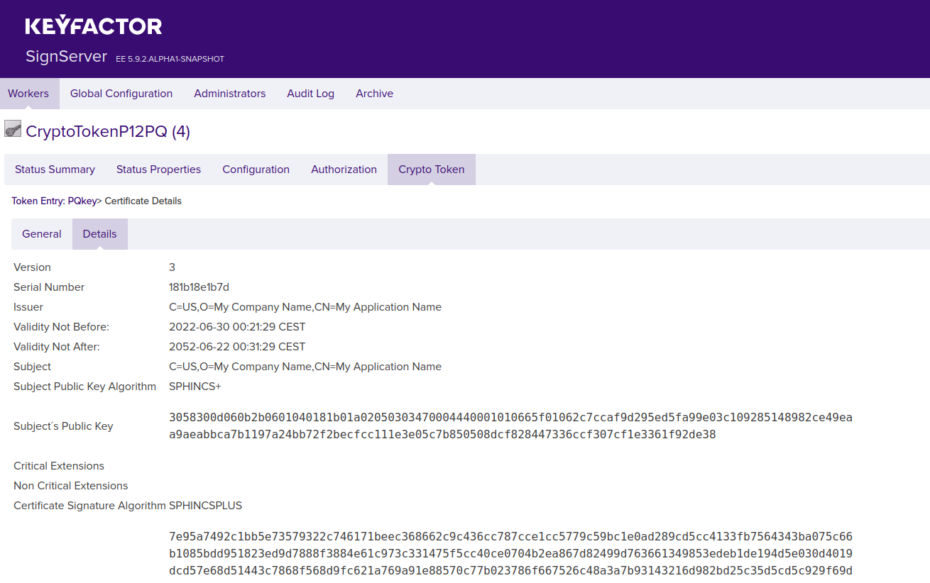 By using the CMS Signer and the Keystore Crypto Token with the SPHINCS+ or CRYSTALS-Dilithium algorithms, you can experiment with creating post-quantum keys and signatures, and associated self-signed post-quantum certificates, also using the SPHINCS+ or CRYSTALS-Dilithium algorithms.