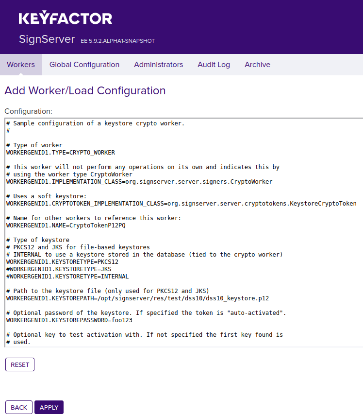 SignServer workers use a crypto token to talk to the software keystore and you therefore need to set up a worker to hold this crypto token.
