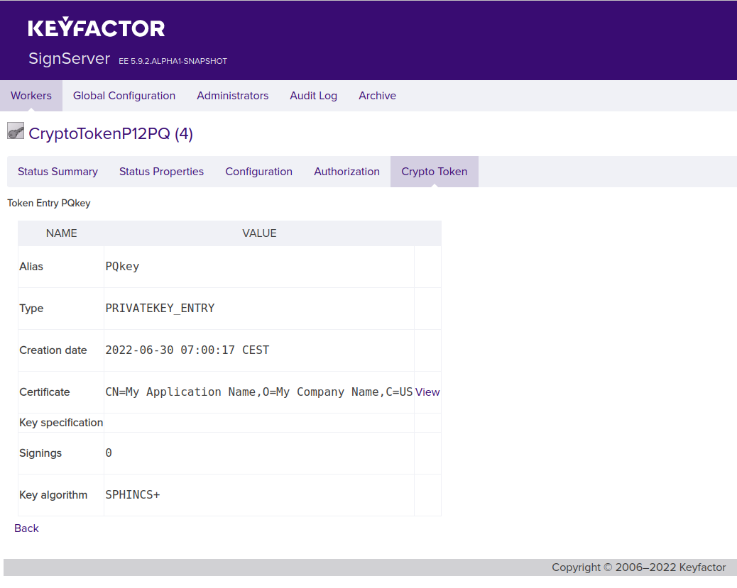 Note the name of the crypto worker (CryptoTokenP12PQ) as you will need it in later steps when setting up the CMS Signer.