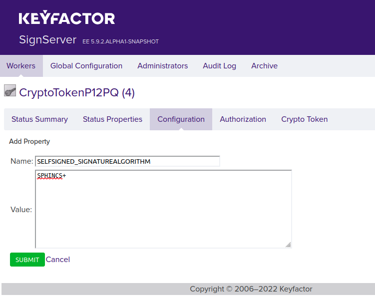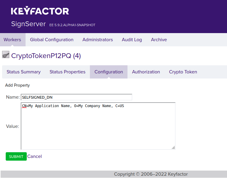 - Set the following crypto token properties to automatically generate a self-signed post-quantum certificate with the specified name and algorithm when generating a key (see General properties):