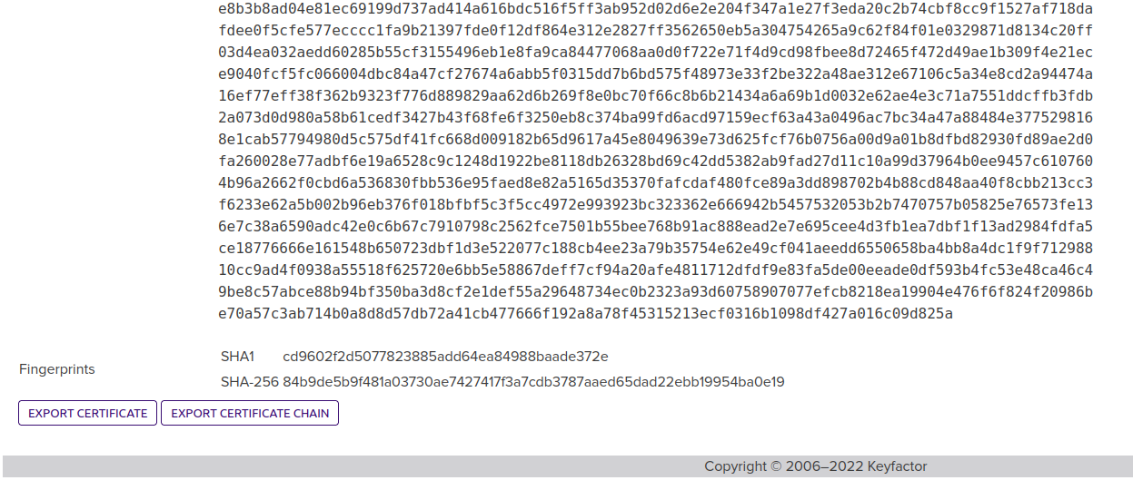 On the Details tab, scroll down to the end of the page and click Export Certificate Chain to download the certificate chain as a PEM file.