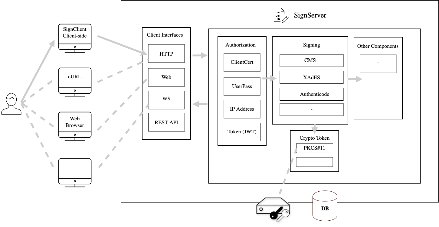 Internally in SignServer, workers and components are handling the request performing the authentication/authorization or interacting with external components. The configuration and logs can optionally be stored in a database.