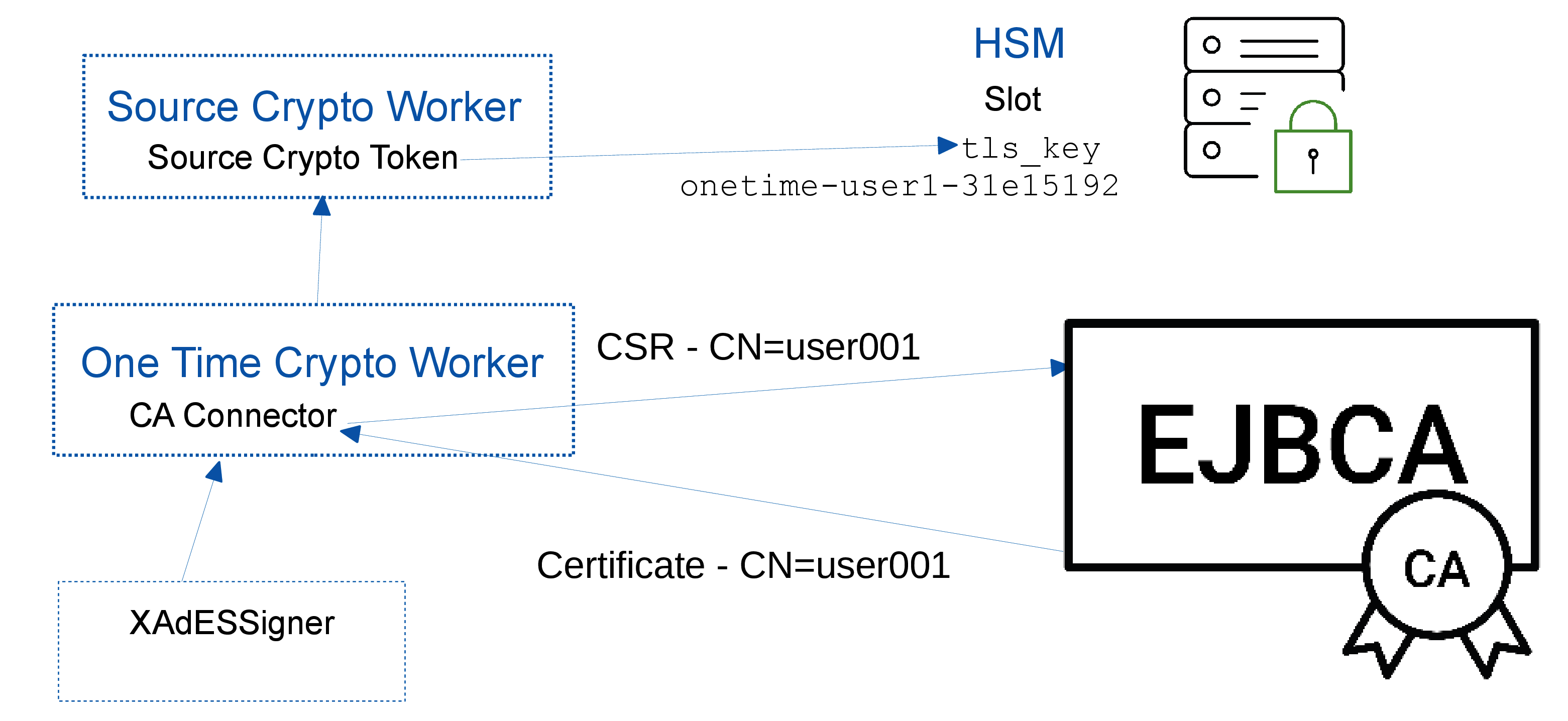 The One Time Crypto Worker references the Source Crypto Worker to get hold of the TLS key/certificate in order to connect to EJBCA CA and also to perform one time key creation/deletion operations in HSM before/after signing respectively.