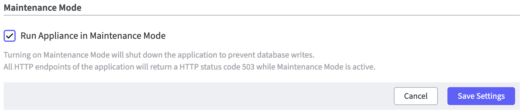When Maintenance mode is enabled, all HTTP endpoints of the Software Application return an HTTP status code 503.