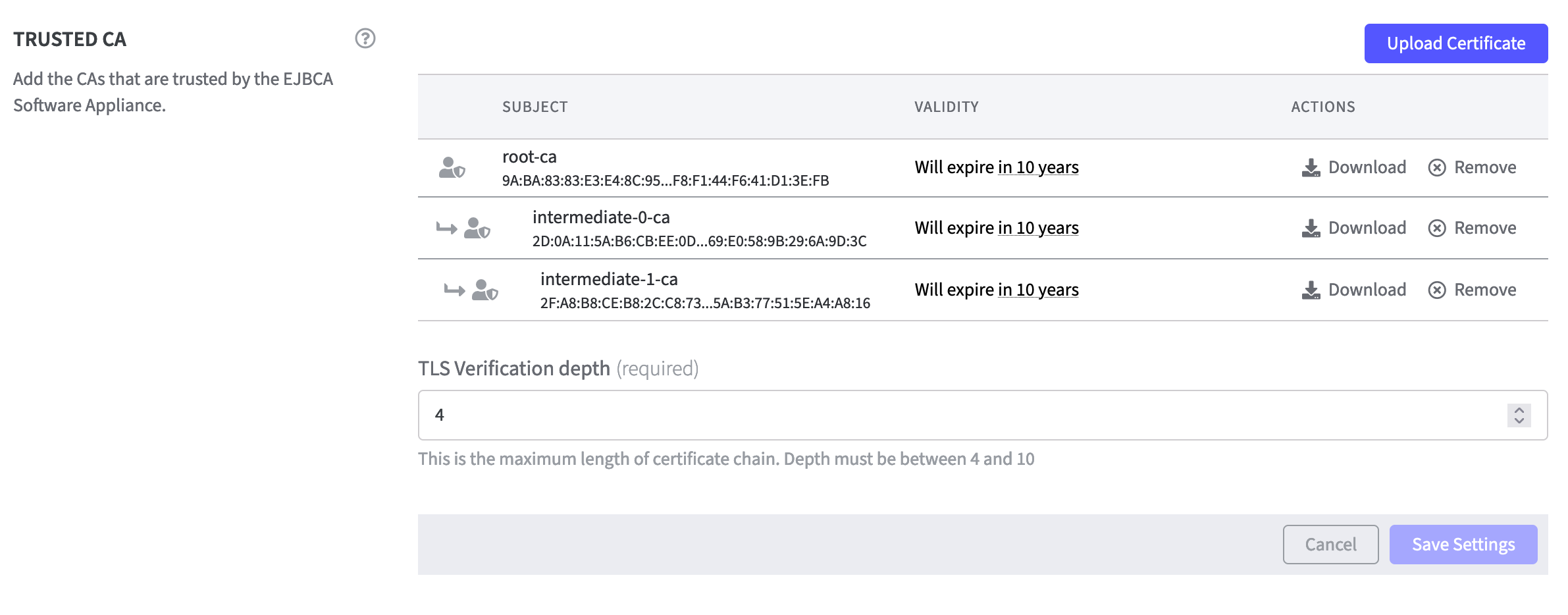 To create a 3-tier CA hierarchy means 3 Trusted CAs, as shown below. If you want to use a 4-tier CA hierarchy, there should be 4 Trusted CAs. For more information please refer to: Part 3a: EJBCA Configuration