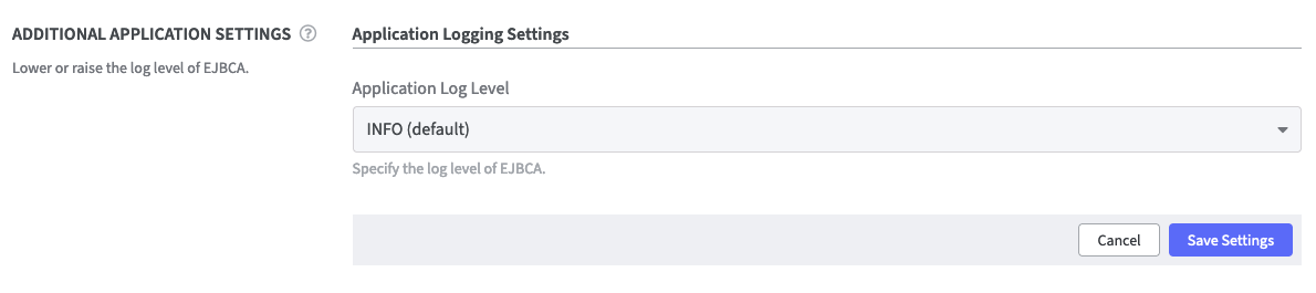 In the section Additional Application Settings the Application Log Level is set to INFO as default.