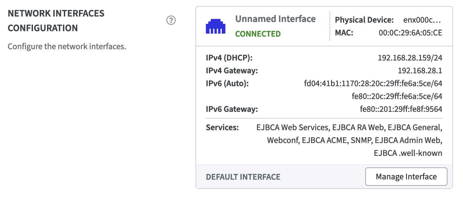 The section Network Interfaces Configuration, displays all the network interfaces that have been set up through the hypervisor. When the Software Appliance is started for the first time, it identifies the first interface and designates it as the Default Interface with all services enabled. Of course, this can also be configured subsequently. On the Default Interface, at least the Webconf service is always activated.