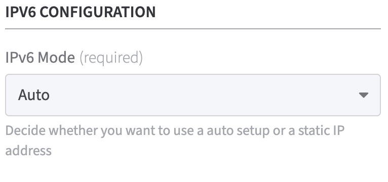 IPV6 Configuration: use the drop down menu to configure whether to use a auto setup or an IP address.