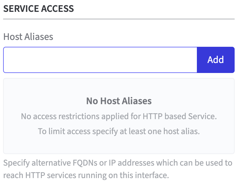Service Access: set a Host Alias to specify a list of allowed host header values, as host names and IP addresses. This ensures secure and flexible operation in proxy and non-proxy configurations.