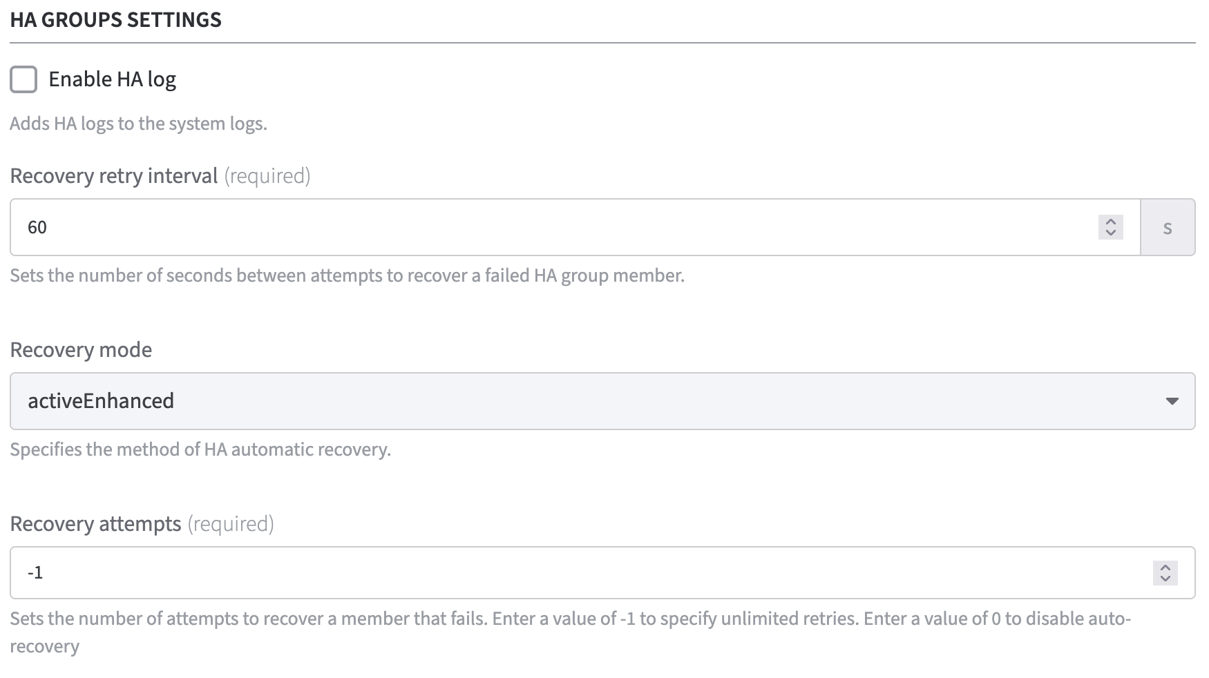 To set the number of seconds between the Recovery attempts of a failed HA group member, use the arrow keys.