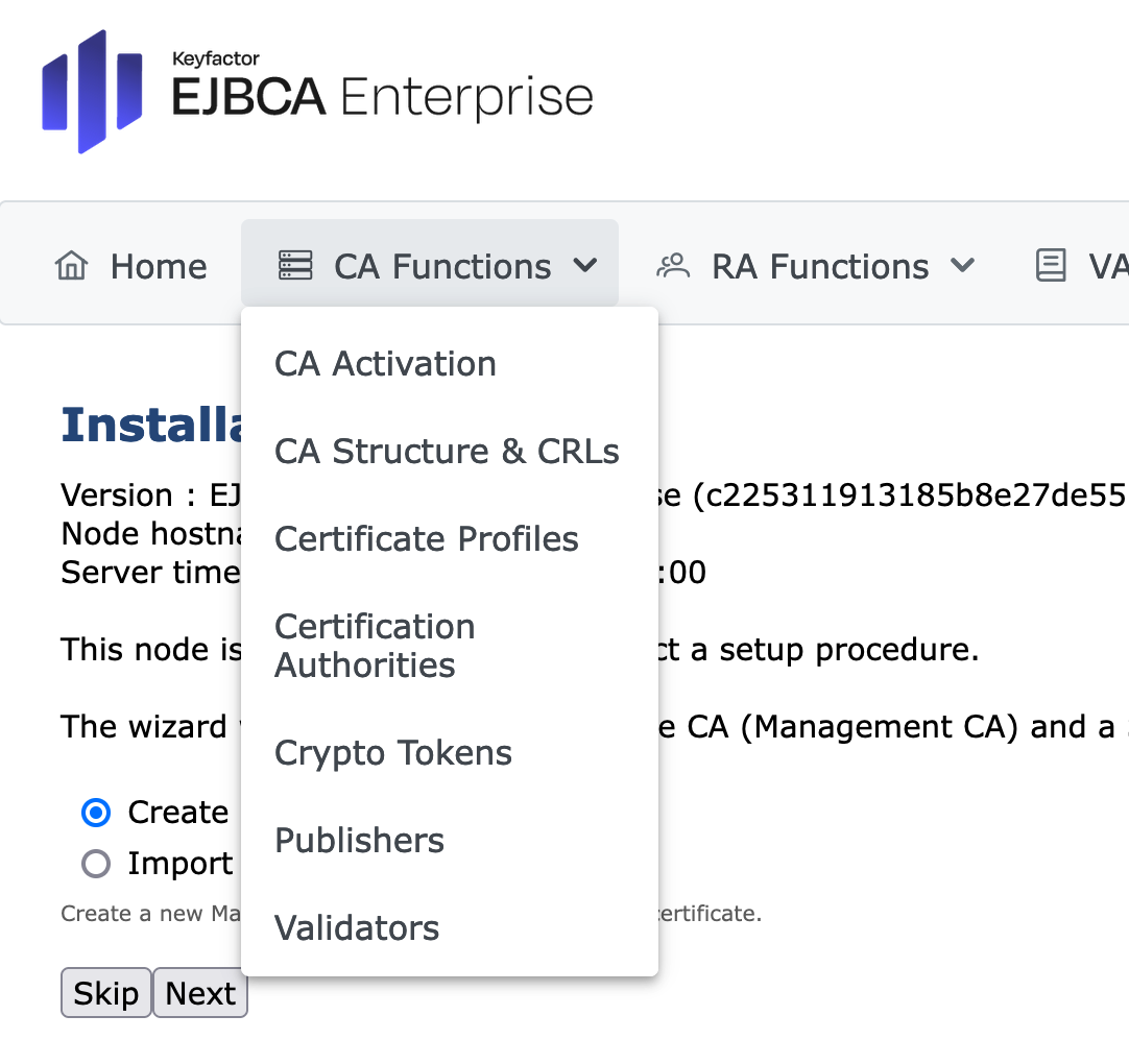 Check whether the Create new CA checkbox is selected.Open the CA Functions drop-down menu in the top menu.