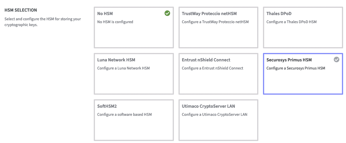 The following covers how to configure a Securosys Primus HSM or Securosys CloudHSM for the Software Appliance. For more information on the Securosys HSM, refer to the Securosys product documentation that you received with your purchase of the HSM.