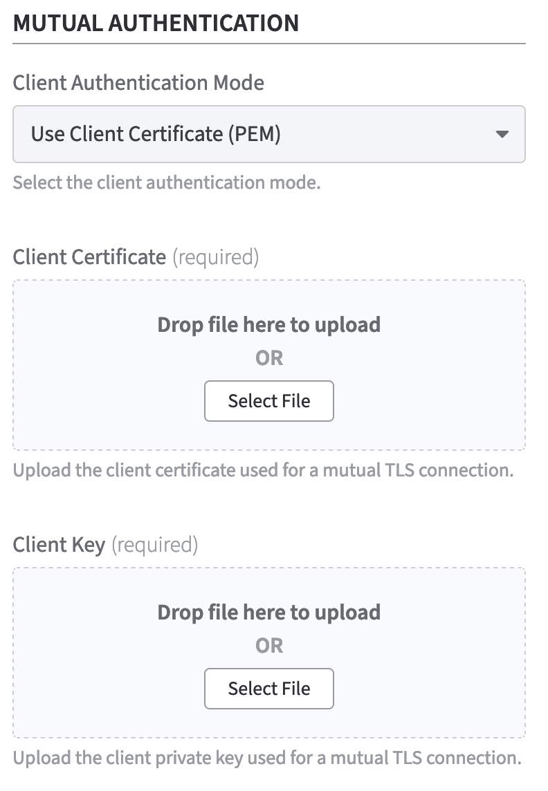 Upload the Client Certificate and the associated Client Private Key that the Software Appliance should use to establish a TLS connection.