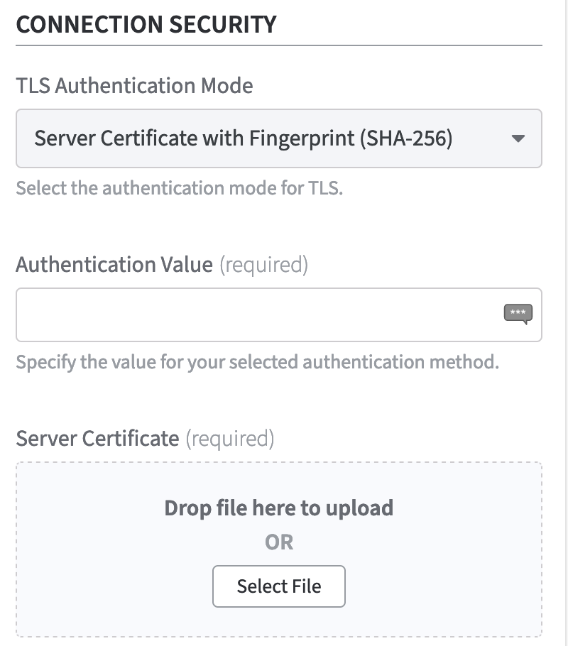 Upload the Server Certificate and enter its SHA-256 as the Authentication Value.