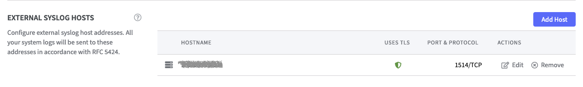- In the section External Syslog Hosts, click Add Host to open the corresponding form.