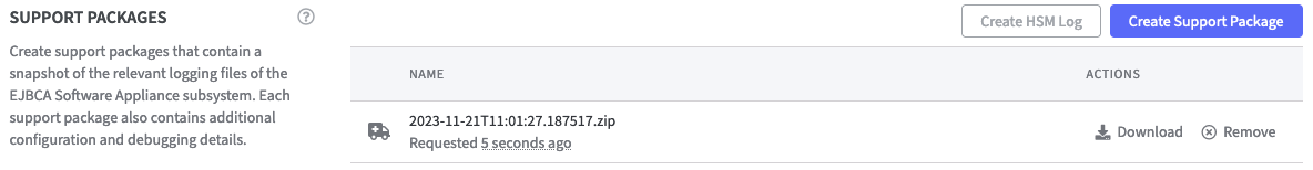 The Software Appliance provides the ability to create an HSM support package that contains a log file with important information about the currently configured HSM.