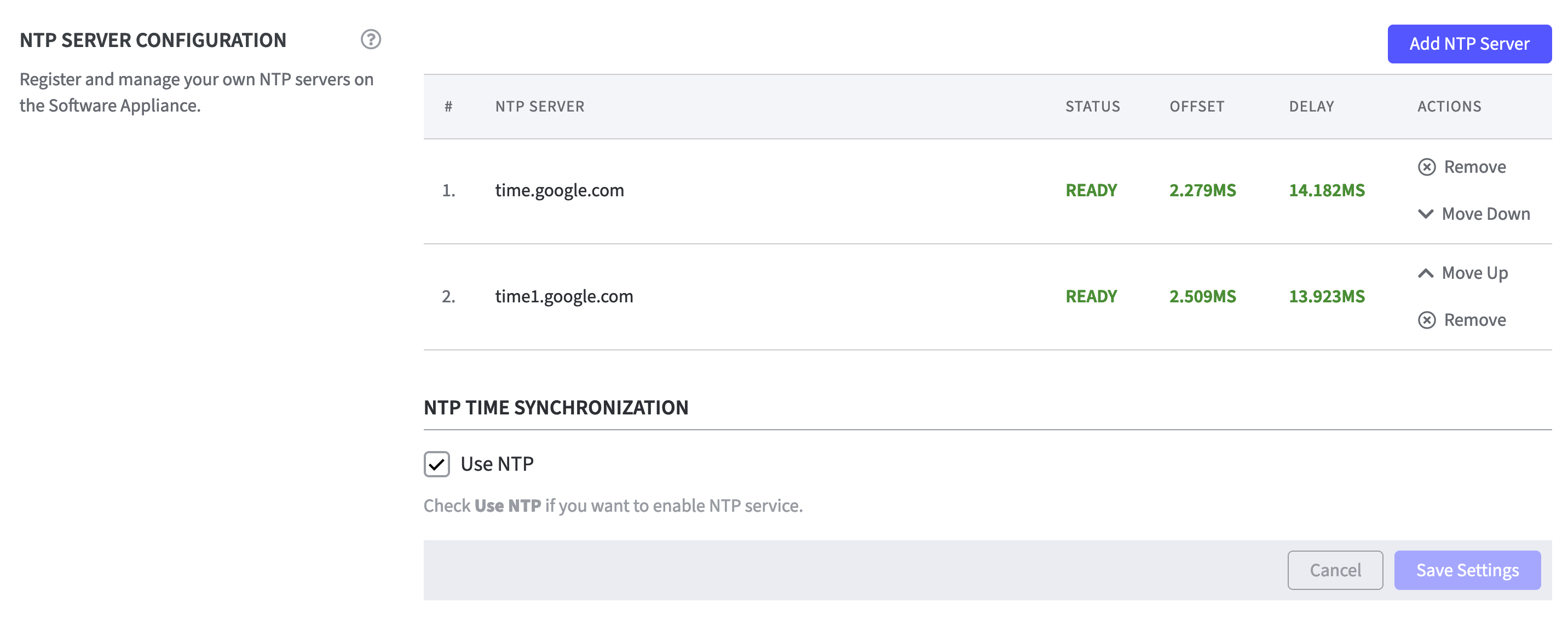 If more than one NTP server is configured, use the Move Up/Move Down function to change the order of the NTP servers.