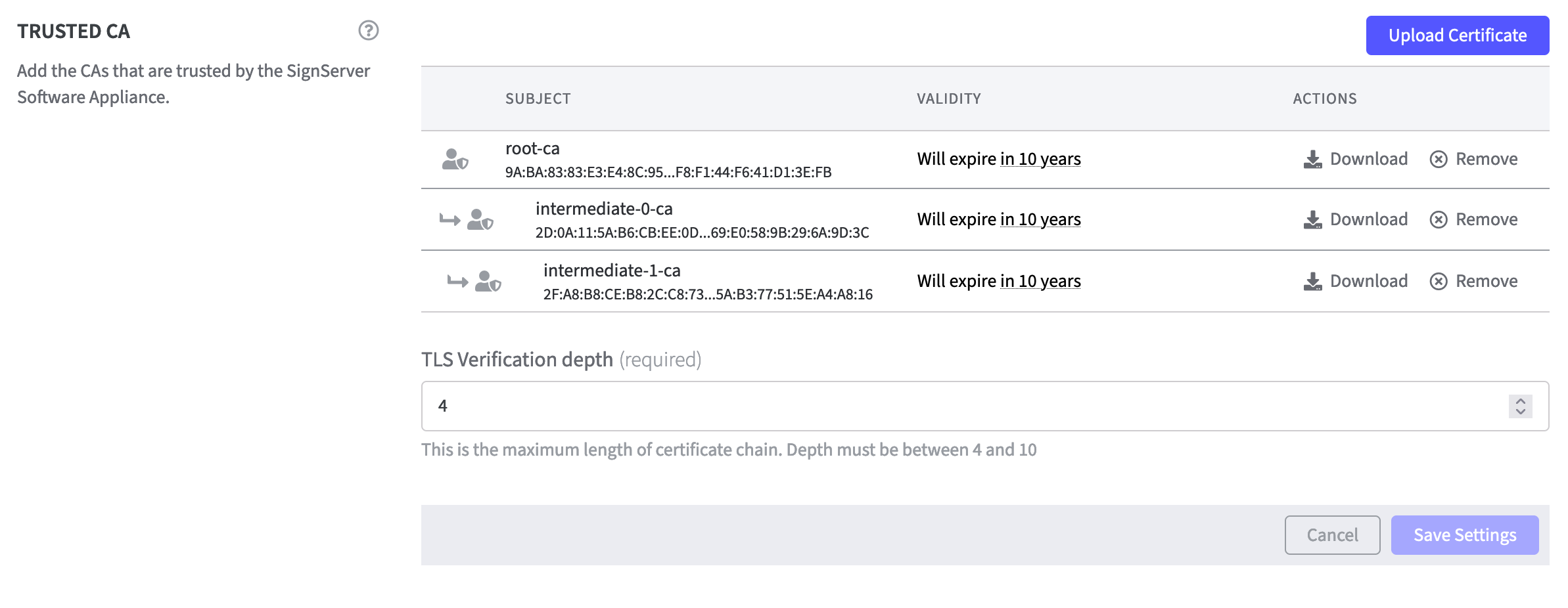 If you want to add more Trusted CAs, you must increase the TLS Verification depth.