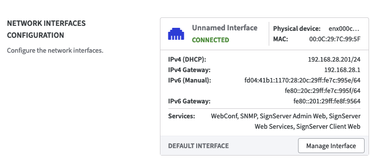 The section Network Interfaces Configuration, displays all the network interfaces that have been set up through the hypervisor. When the Software Appliance is started for the first time, it identifies the first interface and designates it as the Default Interface with all services enabled. Of course, this can also be configured subsequently. On the Default Interface, at least the Webconf service is always activated.