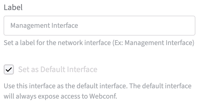 Label: the option to set a label for the network interface. For example the interface that grants the access to Webconf and is set as Default can be named: Management Interface.