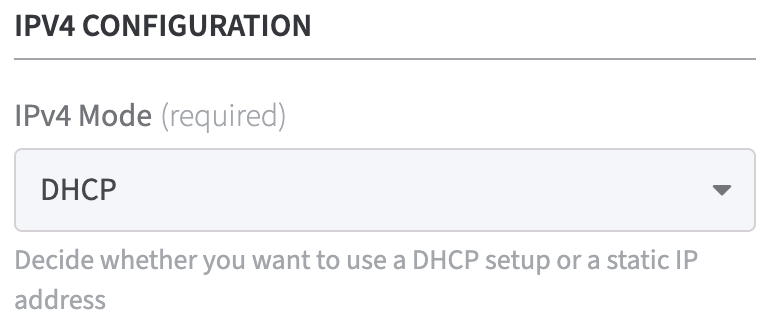 IPV4 Configuration: use the drop down menu to configure a DHCP or a static IP address.